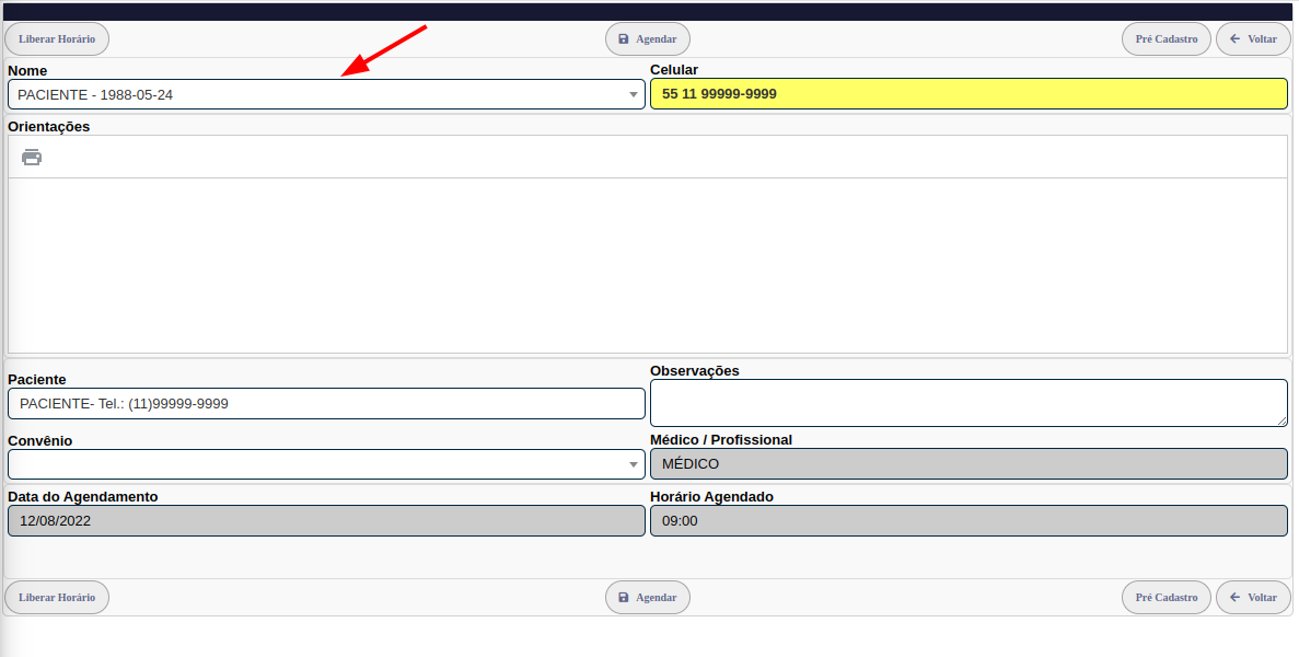 Uma nova página será aberta. Selecione o paciente e clique em Agendar.