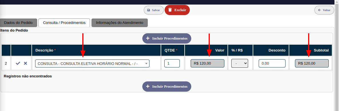 Ao clicar em Incluir Procedimentos um novo registro será gerado.