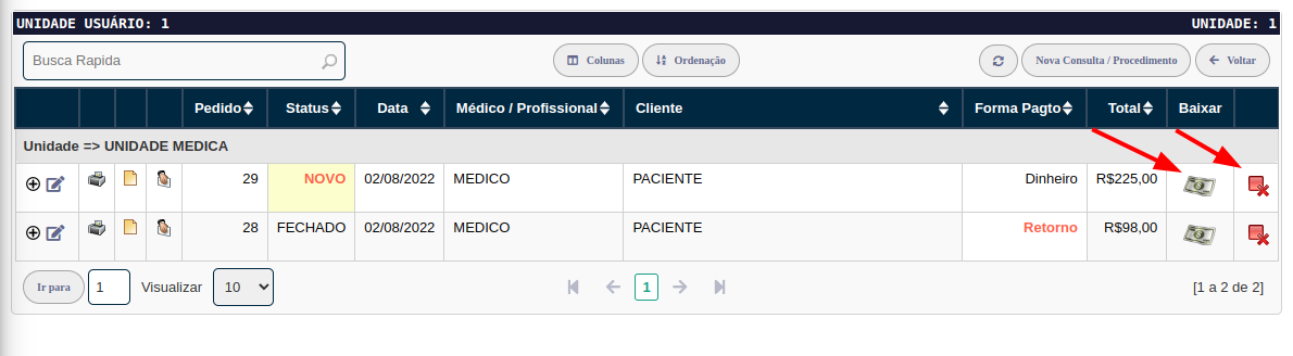 Utilize o ícone Dinheiro para realizar a baixa do pagamento e enviar para o financeiro, o status do pedido mudará de "Novo" para "Fechado".