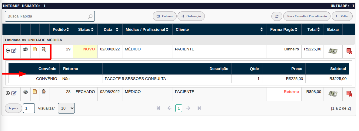 Clique no botão Nova Consulta / Procedimento ou no botão Editar para editar um registro já existente.