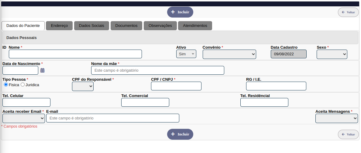 Para realizar o cadastro dos pacientes apenas as abas Dados do Paciente e Endereço são necessárias.