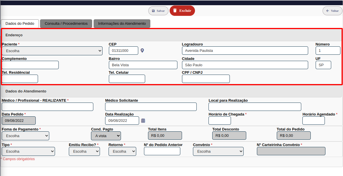 Os campos em cinza: Cond.Pagto, Total Itens, Total Desconto e Total do Pedido são preenchidos automaticamente ao realizar a inclusão de procedimentos na próxima etapa.