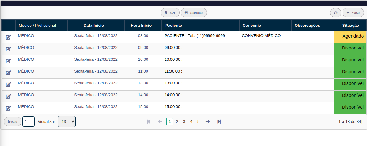 Após gerar os horários acesse o menu Agendas. Todos os horários disponíveis aparecerão aqui. Selecione um dos horários para agendar um paciente.