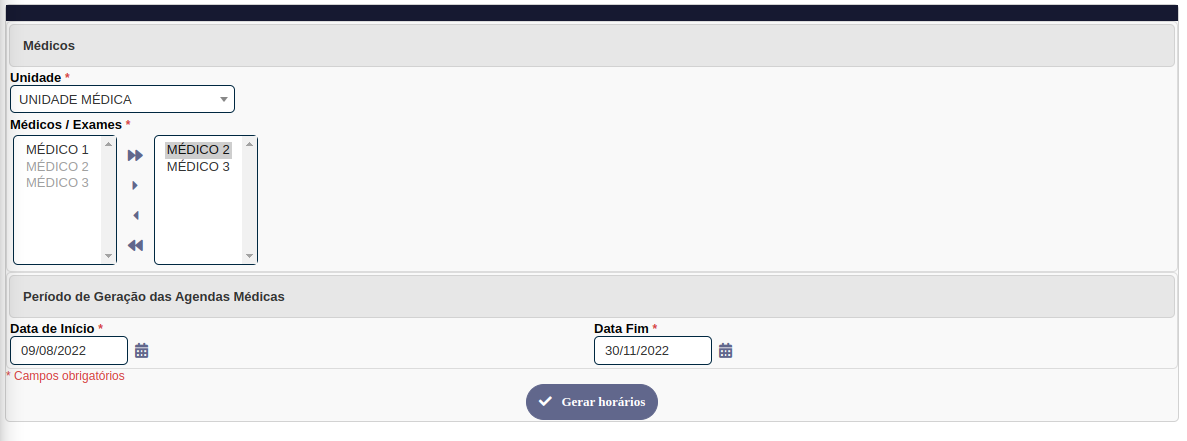 Feito isso acesse o menu Abrir / Gerar Horários Agenda. Selecione a unidade, médicos e o período em que eles irão atender e clique em Gerar Horários.