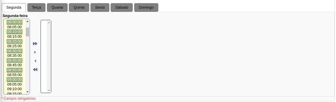 Após selecionar os horários utilize a seta (>) para usar apenas os horários selecionados ou (>>) para pegar TODOS os horários.