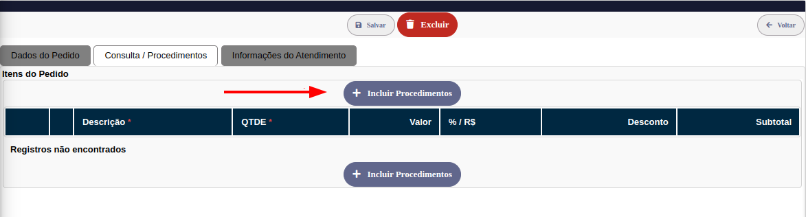 Ao clicar em Incluir Procedimentos um novo registro será gerado.