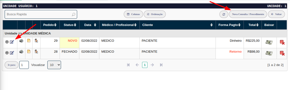 Clique no botão Nova Consulta / Procedimento ou no botão Editar para editar um registro já existente.
