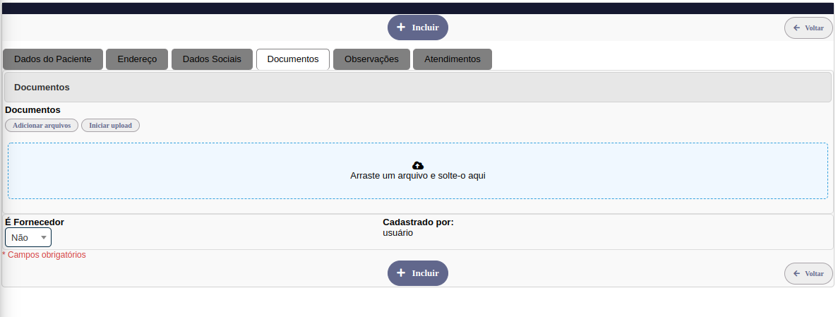 A página de documentos é utilizada para anexar documentos dos pacientes como RG, CPF etc...