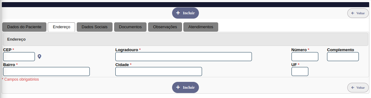 Para realizar o cadastro dos pacientes apenas as abas Dados do Paciente e Endereço são necessárias.